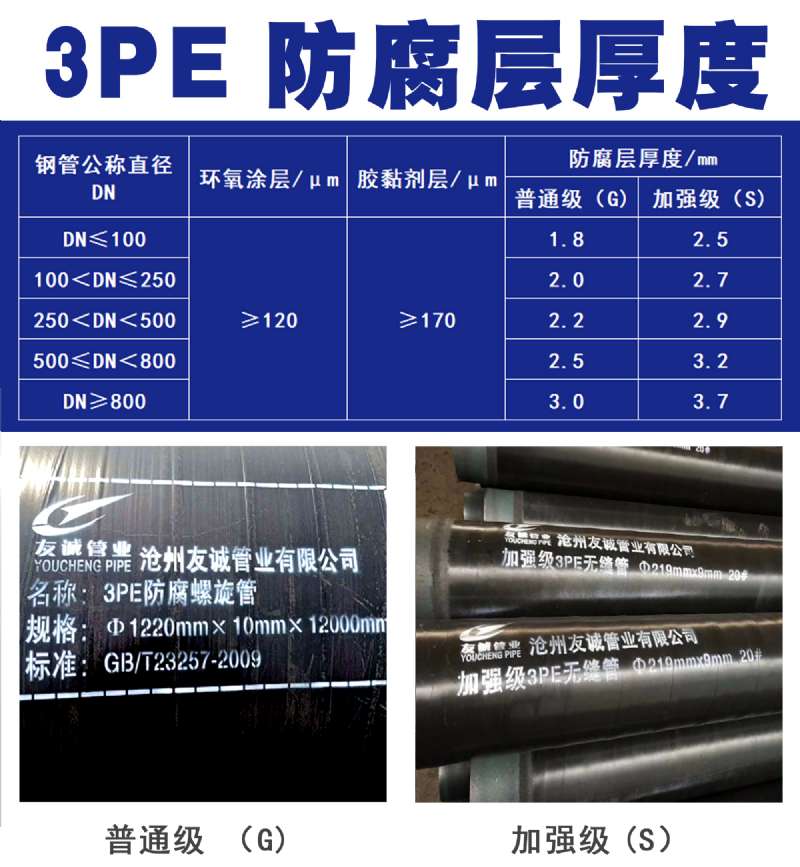 一般都聽說過3pe,但是您真正知道指的是什么嗎?友誠(chéng)武建偉【13703173800】帶您做具體了解: 擠壓聚乙烯涂敷鋼管分三層PE防腐結(jié)構(gòu):一層環(huán)氧粉末(FBE>um),二層膠粘劑(AD)170至50um,三層聚乙烯(PE)2.5至3.7mm。三種材料融為一體,并