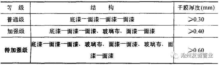 為適應不同防腐環(huán)境對防腐層的要求,環(huán)氧煤瀝青防腐層分為普通級,加強級,特加強級三個等級。其結構由一層底漆和多層面漆組成,面漆層間可加玻璃布增強。在腐蝕環(huán)境惡劣或用戶要求下,防腐層可適當增加面漆層數(shù),防腐的等級和結構表如下: