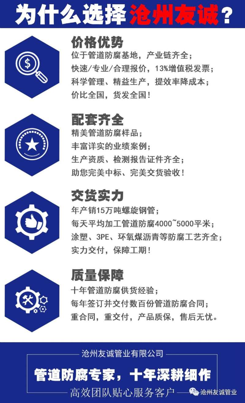 友誠管業(yè)作為十年的實力管道防腐廠商,我們一直致力于為客戶提供高品質產品、貼心售后服務,努力踐行“為客戶創(chuàng)造價值,為社會創(chuàng)造效益,為員工創(chuàng)造幸�!钡钠髽I(yè)使命。